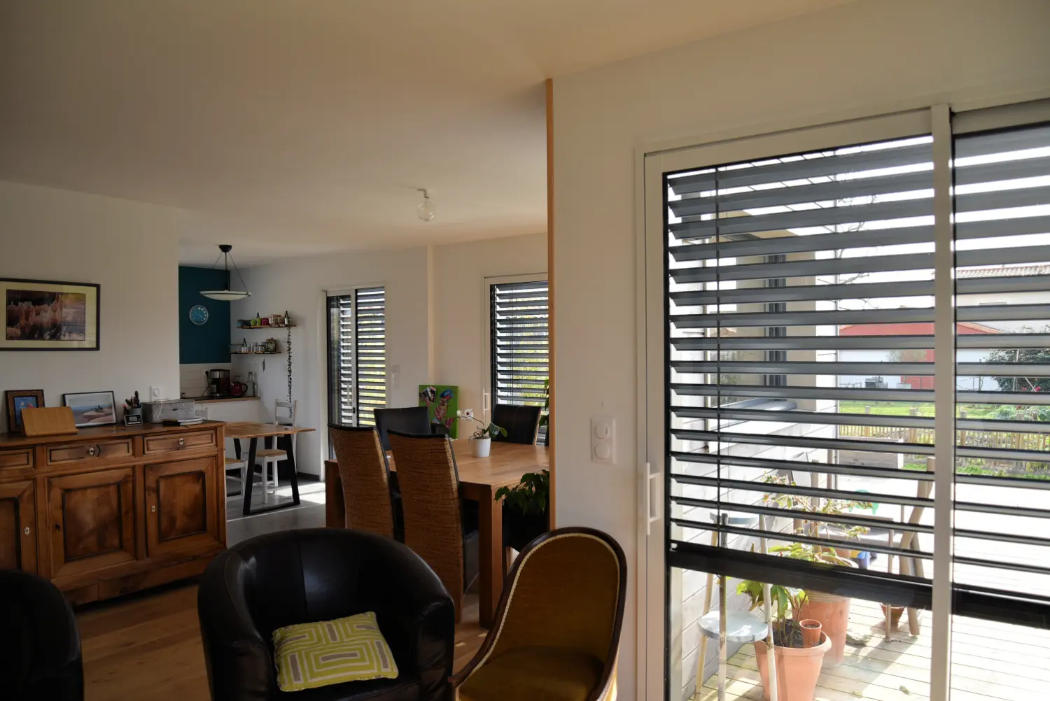 Les grandes ouvertures au sud permettent de profiter au maximum de l’ensoleillement naturel tout en limitant les surchauffes d’été grâce aux brise-soleils à lames orientables.