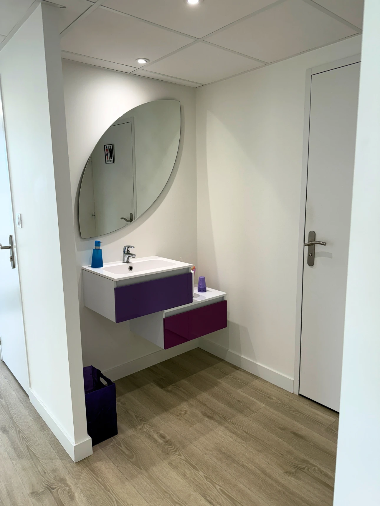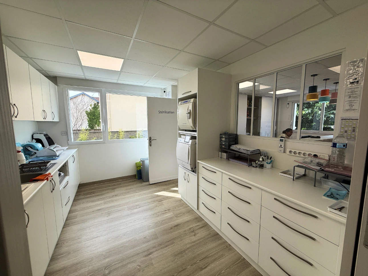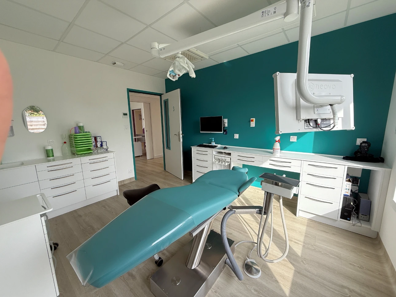 L’entrée du cabinet donne sur l’accueil, une salle d’attente, ainsi que différentes pièces techniques à destination des assistantes du praticien. Une circulation intérieure mène aux 4 salles de soins et à un petit local technique.
