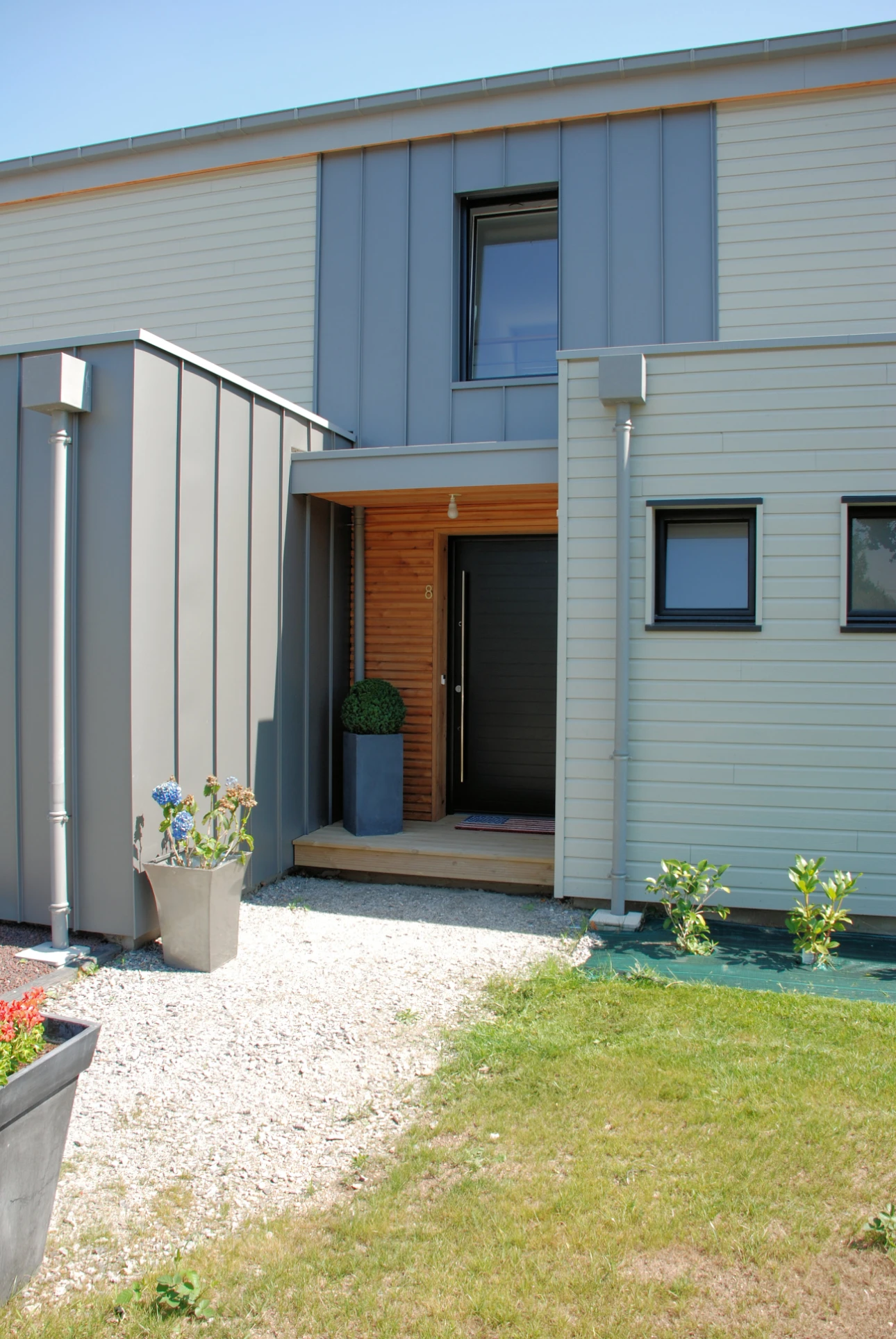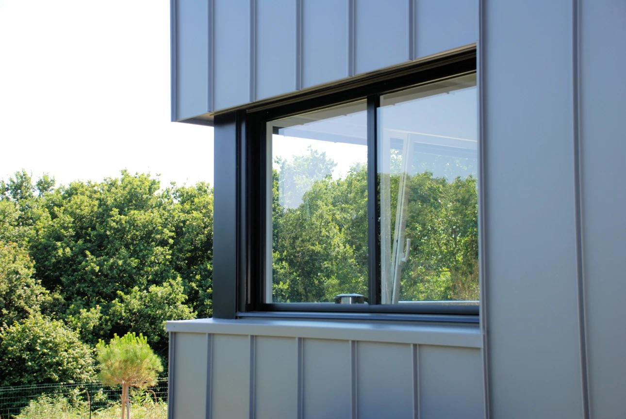 Un jeu de bardage gris clair et une vêture bac acier viennent animer les façades de cette habitation orientée principalement vers le sud afin de profiter au maximum des apports solaires en hiver.