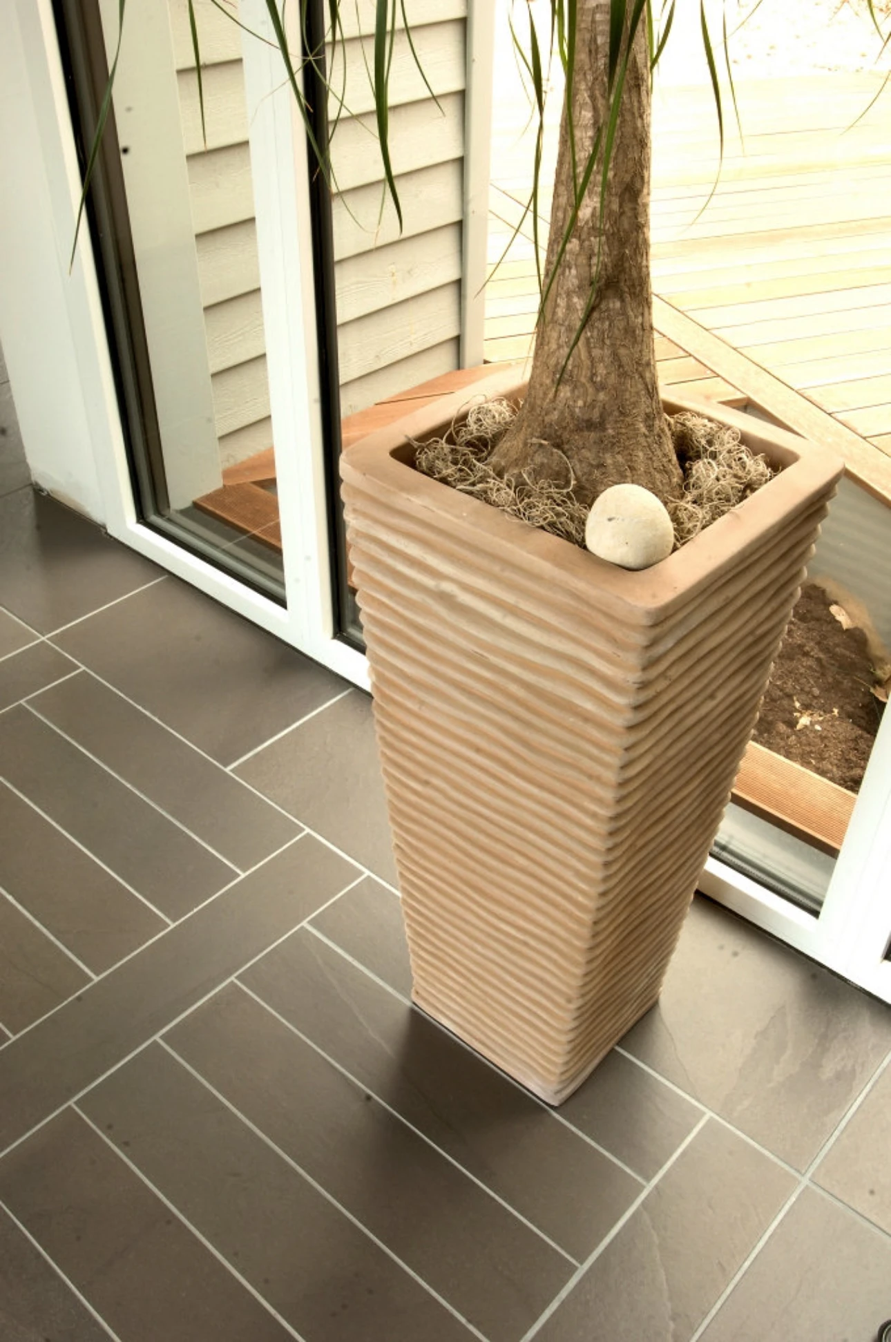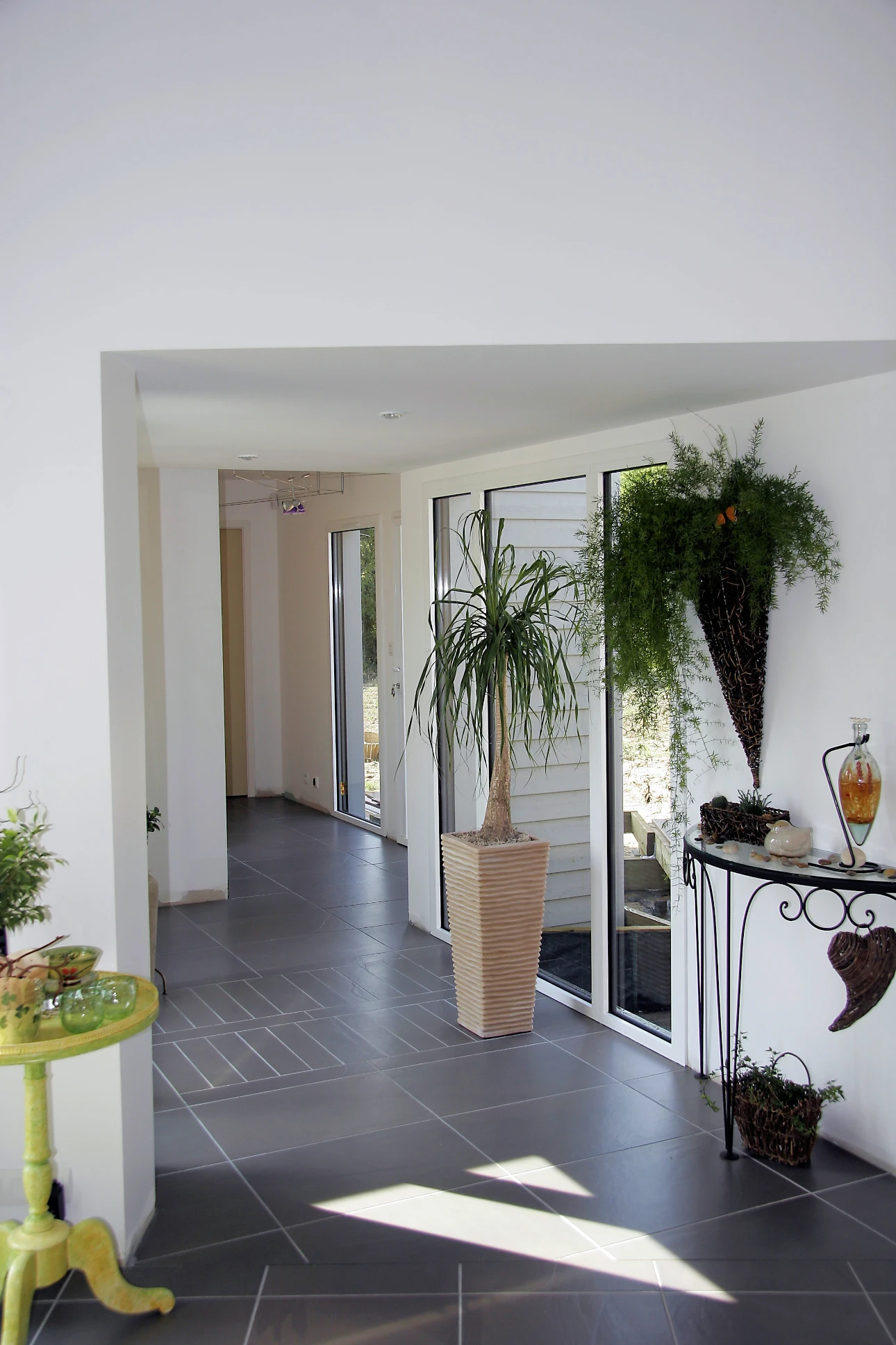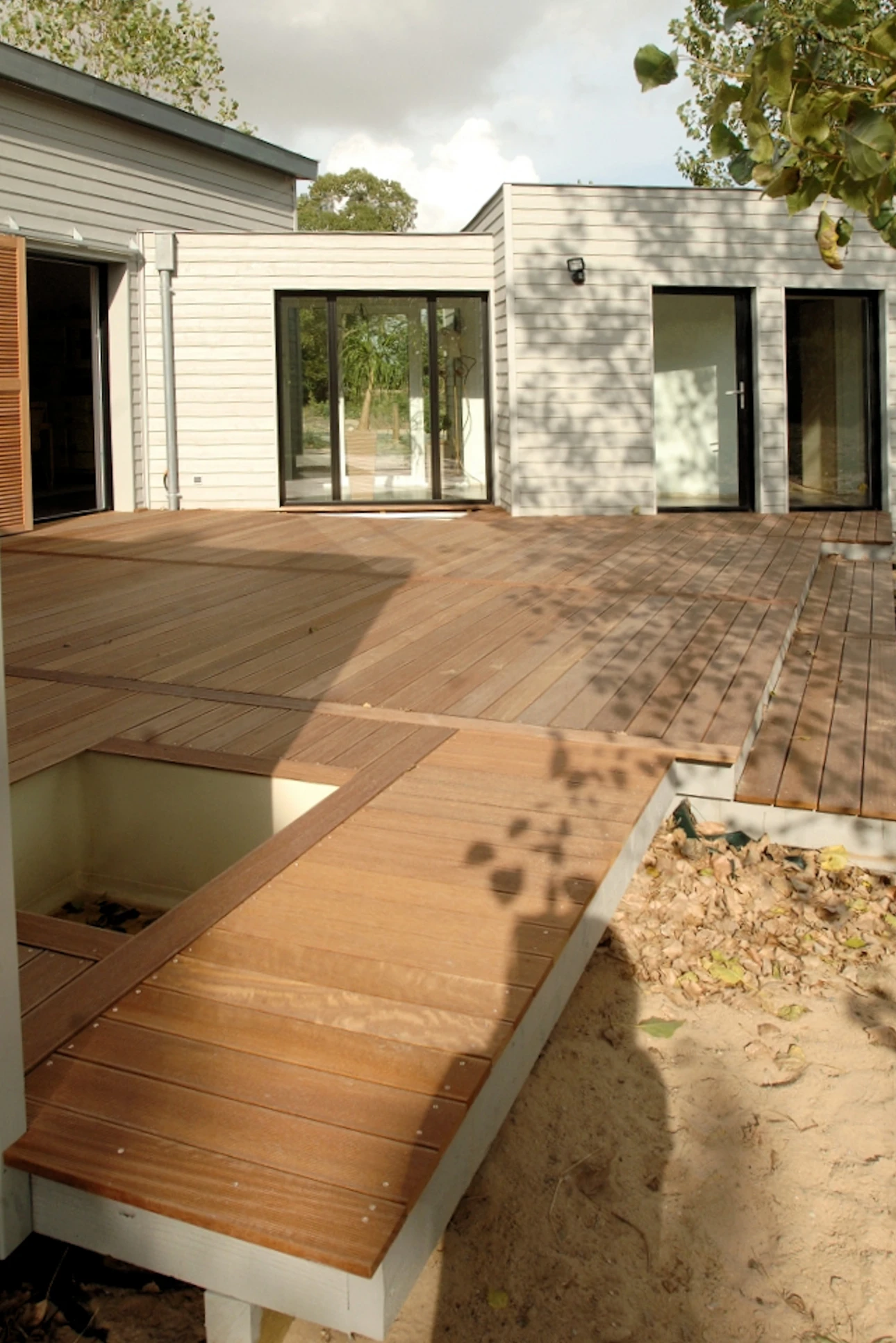 Pour épouser la forme du terrain, une de ses ailes s’évase vers l’extérieur ouvrant la vue sur le paysage. La beauté de ce patio semi-clos provient autant de son harmonieuse proportion que du dessin soigné de la terrasse.