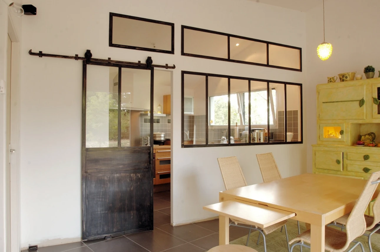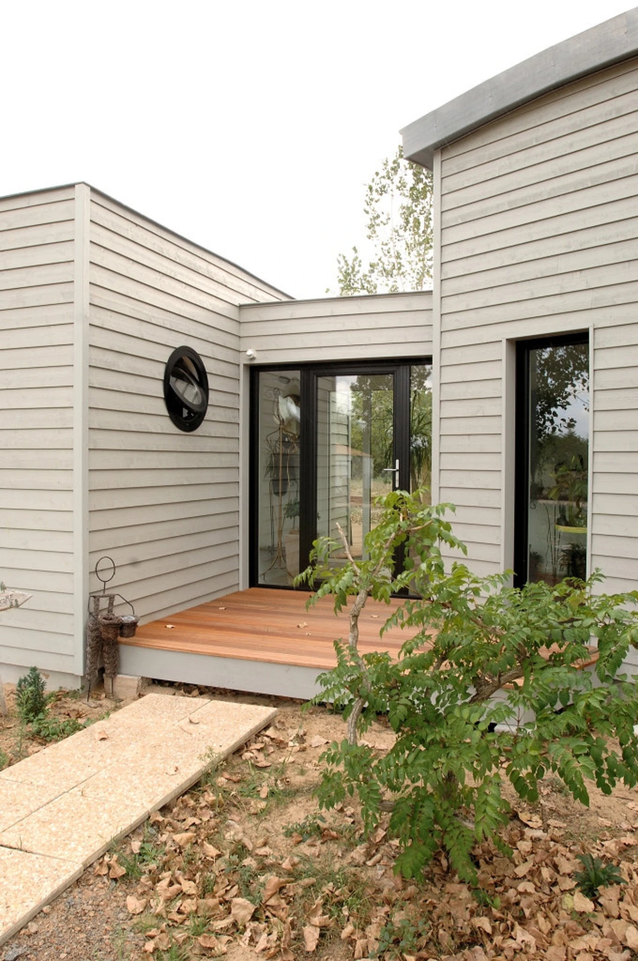 La sobriété des lieux s’exprime dans un bardage gris simplement rehaussé par des menuiseries noires.