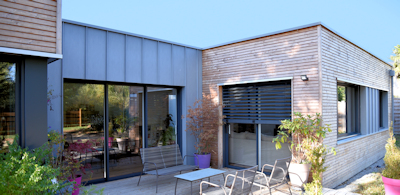 De volumétrie simple par le choix d’une construction en toiture terrasse, des décrochés et un jeu de matériaux (alternance de Douglas naturel et vêture métallique) viennent animer les façades